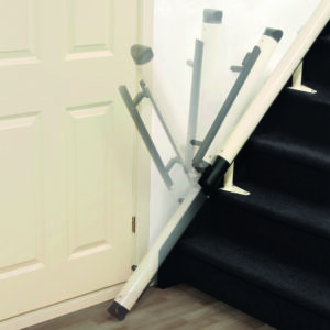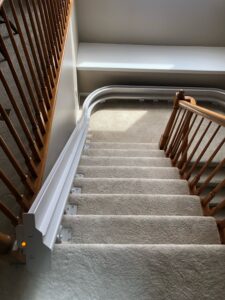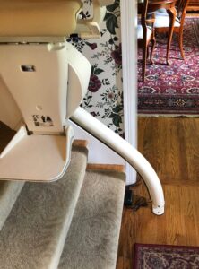 Staircases that end in high traffic areas or doorways can create an obstacle. Depending on the pitch of your stairs, the rail can extend anywhere from 13” to 21” past the bottom of the last step. Manufacturers offer custom solutions. Check out the options below on how to best end your stairlift rail.