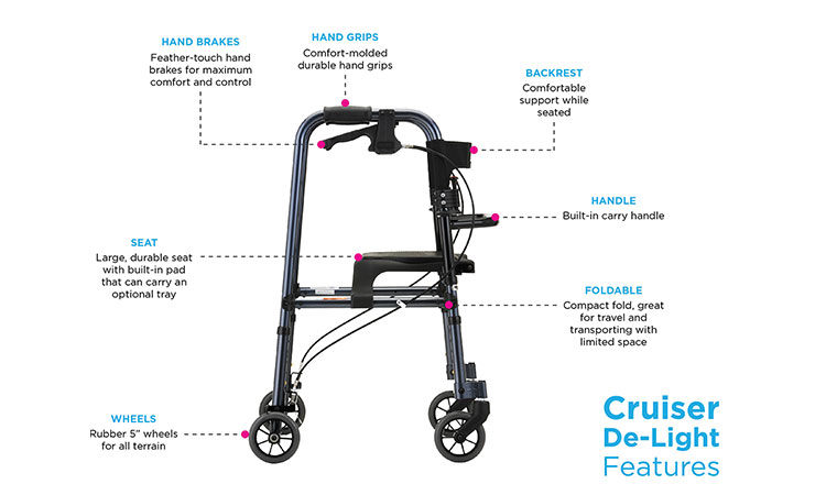 The Nova Cruiser De-Light Rollator deserves it’s own category. A hybrid between a standard wheeled walker and a rollator, it highlights the benefits of both. The only 4-wheeled rollator that folds and has adjustable legs like a standard walker, but boasts a seat and locking hand brakes like a rollator. In addition the seat folds forward so individuals can walk inside the frame which mimics the feel of a traditional walker. Come and try one today and see how the Cruiser De-Light feels to you.